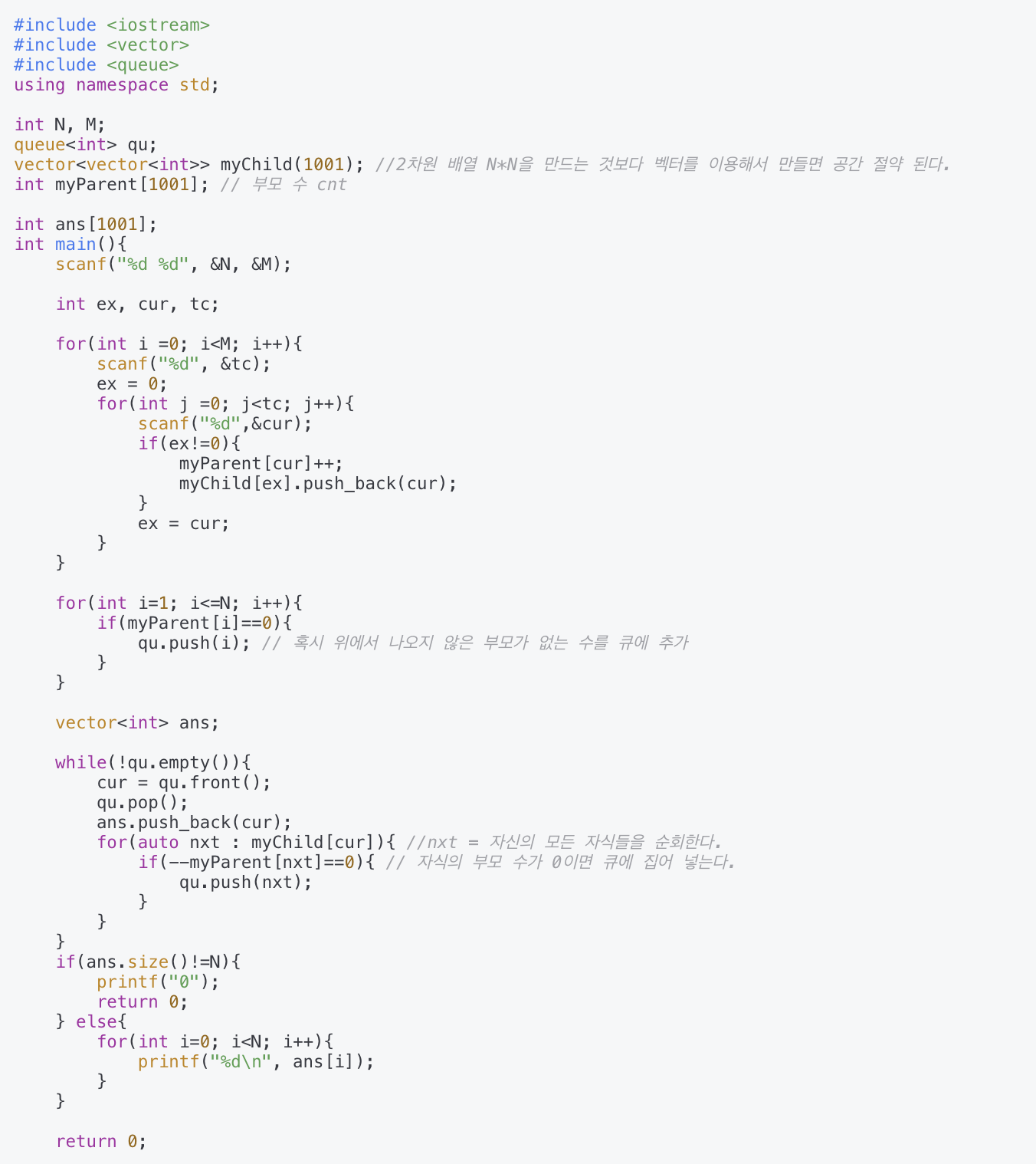 if(--myParent[nxt]==0){ // 자식의 부모 수가 0이면 큐에 집어 넣는다.